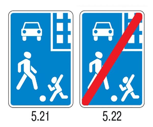 Знак «Жилая зона» 5.21 обозначает въезд в жилую территорию, а «Конец жилой зоны» 5.22 (перечёркнутый) — выезд. Соответственно, 5.21 располагается при въезде в территорию жилой застройки с постройками социального и коммунального назначения, а 5.22 — при выезде из этой зоны. Несмотря на то что большинство подобных территорий не отмечены данным указателем, на их территории действует особый порядок организации и осуществления дорожного движения. К жилой зоне могут быть отнесены территории жилой застройки, а также прилежащая спортивная, социальная и другая инфраструктура, растительность, детские площадки, сады, парки, скверы, аллеи и т.д.