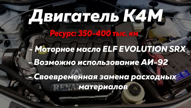 Силовой агрегат K4M характеризуется завидным ресурсом, при бережной эксплуатации такие двигатели служат до капитального ремонта по 400 тыс. км и более. Максимально допустимый расход масла в исправном ДВС не должен превышать половину литра на одну тысячу километров.