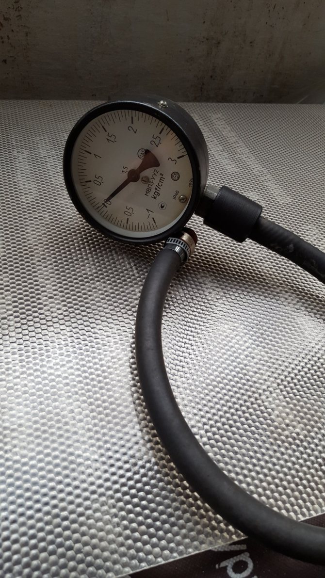 Как в первом методе, машину лучше поднять или загнать на яму. Далее необходимо снять первый лямбда-зонд (он же датчик кислорода), и на его место подключить манометр. Поскольку напрямую вкрутить его не получится, необходим переходник, которым может выступать резиновый шланг. Важно его соединить таким образом, чтобы создать полную герметичность. После этого двигатель заводят и поднимают обороты до 2500-3000 за секунду, поддерживая их 10-15 секунд. За это время необходимо зафиксировать показания манометра. Далее значения сравниваются со следующими данными: