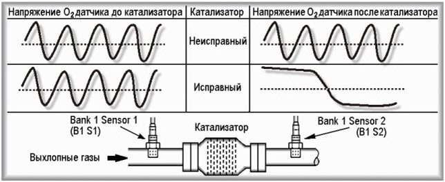 При нормальном функционировании каталитического нейтрализатора сигнал подогреваемого кислородного датчика, находящегося на выходе, переключается медленно между значениями обогащенного и обедненного состояниями. Частое переключение лямбда-зонда между данными состояниями и указывает на снижение эффективности нейтрализатора. В результате чего его способность аккумулировать кислород снижается.