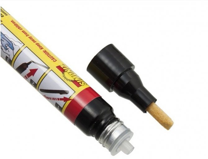 - Маркер. Внешне напоминает фломастер и по сути просто закрашивает. При работе нужно слегка надавливать на него, чтобы жидкость заполняла повреждение.