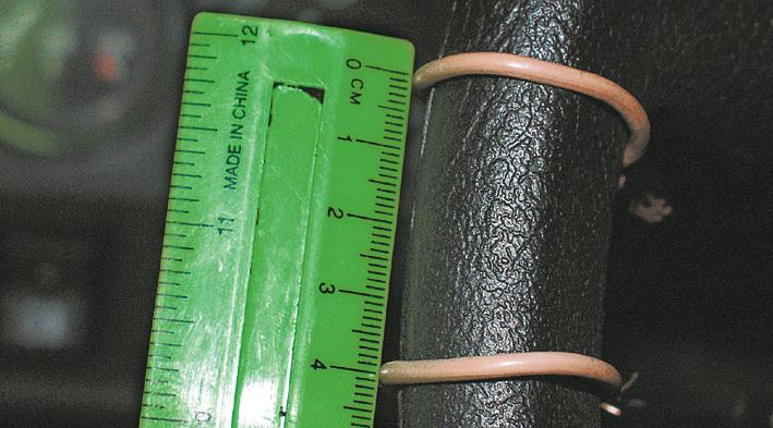- разместите линейку так, чтобы она уперлась в приборную панель, касалась верхней частью переключателя света фар и, вторым концом, обода колеса;