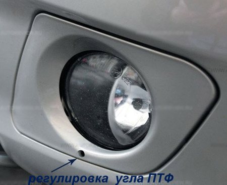 - Работа производится в темное время суток, автомобиль располагается на расстоянии 5 метров от стены, после чего включаются противотуманные фары. Сама регулировка производится с помощью винта, расположение которого показано на фото. То есть для настройки вам понадобится только тонкая крестообразная отвертка.