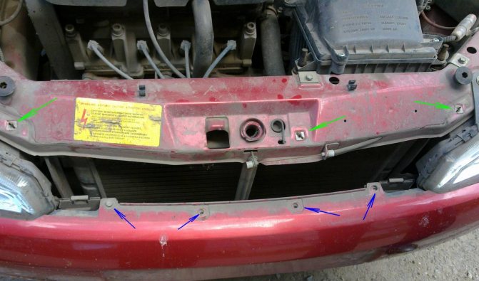 Чтобы снять крепеж бампера, следует снять защелки, фиксирующие решетку (зеленые стрелочки)