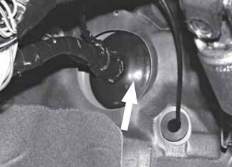 - Следующий этап – прокладка жгута проводов, которые идут в комплекте. Делается это из салона: вначале снимается коврик, и в районе педали сцепления можно найти большой пучок проводки и заглушку. Заглушка продавливается, чтобы освободить отверстие, после чего жгут привязывается к куску проволоки и протягивается под капот, на фото показано, где находится заглушка.
