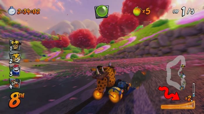 CRT напоминает Mario Kart: здесь тоже разбросаны предметы по трассе. Если собрать 10 фруктов Вумпа, получите преимущество. Мало того, что максимальная скорость увеличится, так еще и появится возможность улучшить оружие и повысить мощность остальных усилителей.