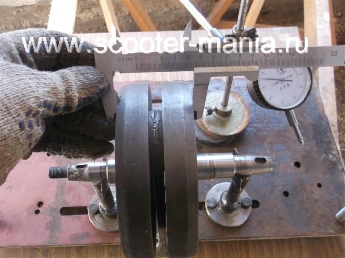 Фото. Отцентрированный коленвал мотоцикла, штангель лежит без зазоров на щеках коленвала.
