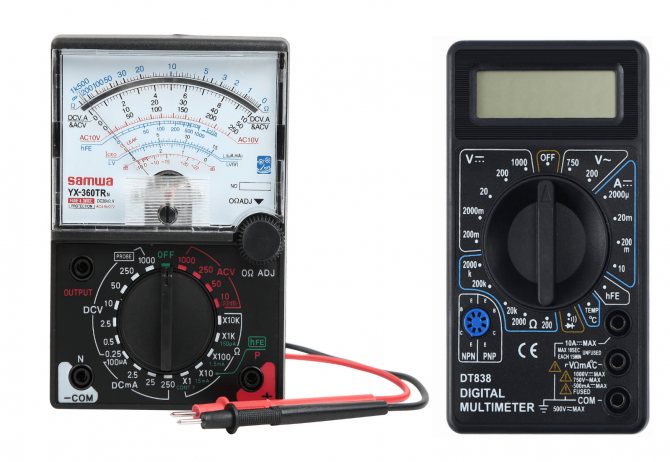 На приборе имеется два вывода. Один из них окрашен в черный цвет, другой — в красный. Общий вывод — черный. На сленге он называется «массой». Красный — это потенциальный вывод. Он используется с целью проведения измерений. Гнездо черного вывода может быть маркировано двумя способами: