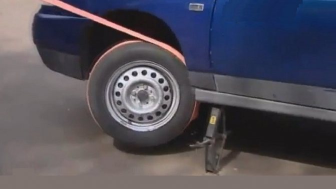 Ещё один вариант запуска подойдёт для машин с передним приводом. Необходимо поднять автомобиль, вывесить одно из колёс. Затем вывернуть его до упора в сторону от машины, намотать на покрышку буксировочный трос или крепкую верёвку длиной 5 метров. Выставить третью передачу, включить зажигание. Резко потянуть за шнур, раскрутив колесо. После запуска мотора поставить рычаг коробки передач на нейтральную скорость. Данный способ проводится с помощником — один человек сидит в машине, другой тянет за верёвку.