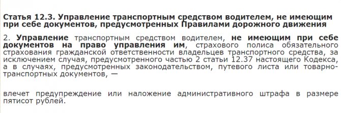 КоАП РФ, Статья 12.3. Управление транспортным средством водителем, не имеющим при себе документов, предусмотренных Правилами дорожного движения.