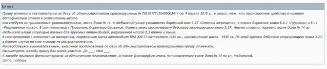 - перечень приложений (копия постановления, фотоматериалы с камеры, документы, подтверждающие правоту заявителя);