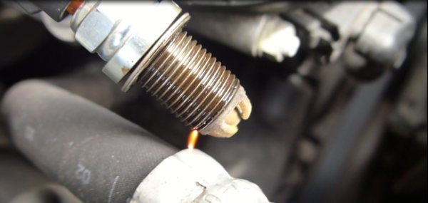 Для диагностики нужно извлечь одну свечу из посадочного места, при этом не отключая от нее провод, а затем поднести ее электродом к ГБЦ или кузову авто. Помощник должен попытаться завести двигатель — если во время прокручивания стартера между электродом свечи и металлом проскочила искра, это говорит о том, что устройство рабочее. Аналогичную процедуру нужно повторить со всеми свечами, только учтите, что искра не должна быть слабой. Изношенные высоковольтные провода также подлежат замене.