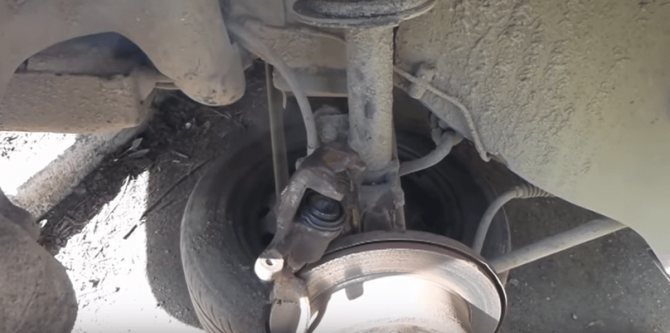 - Первым делом требуется выкрутить тормозной суппорт, для этого нужно поставить автомобиль на домкрат и снять колесо. Стоит отметить, что в некоторых моделях автомобилей суппорт может откручиваться против часовой стрелки;