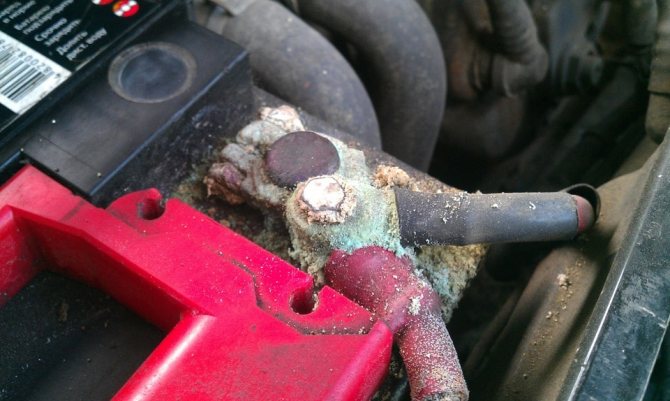 - подгорели, окислились или ослабли контакты элементов цепи (на самой АКБ, на проводе массы, на генераторе).