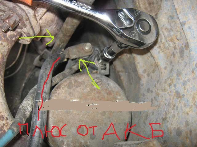 Один минусовой прикручивается к кузову возле аккумулятора, второй, к двигателю — не помню где. Вот это «не помню где» осмотрите, раскрутите, почистите, смажьте и закрутите.