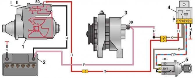 1 – стартер; 2 – аккумуляторная батарея (АКБ); 3 – генератор; 4 – реле включения стартера; 5 – выключатель зажигания