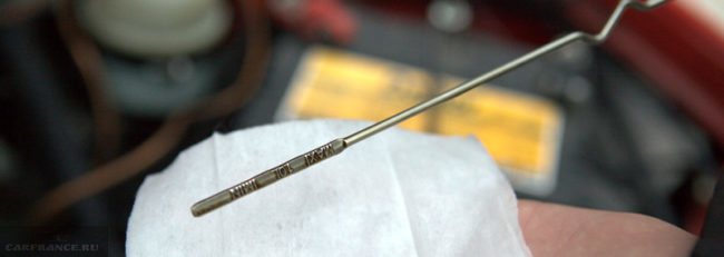 А пока наше масло стекает, исследуйте поверхность двигателя на предмет наличия свежих масляных потеков, проверьте, нет ли на масляном картере видимых повреждений. Посмотрите, как себя чувствует масляный фильтр, не разболтался ли он, не повреждена ли его прокладка. Потом вытащите щуп, протрите его насухо и опустите обратно, затем снова достаньте. Если масляный след находится около или ниже минимальной отметки MIN, долейте масло в двигатель. Проверьте еще раз щупом, поднялся ли его уровень и запустите мотор.