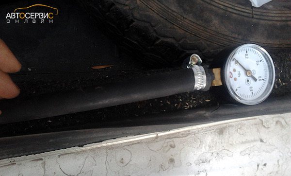 - При помощи шинного манометра, закрепленного хомутиком на штуцере, замеряйте давление при работающем двигателе. Оно должно быть в пределах нормы;