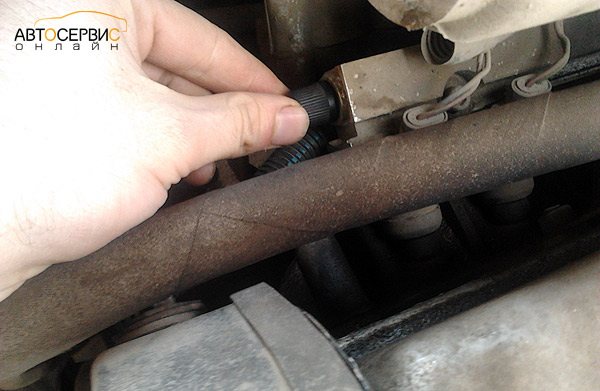 - Сбросить давление в рампе. Просто выкручиваете из штуцера золотник и дожидаетесь, пока не уравняется давление.