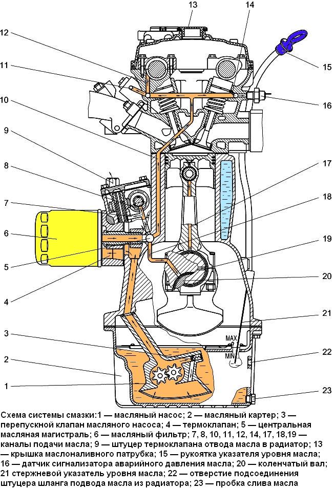 Система смазки включает: масляный картер, масляный насос с приемным патрубком и редукционным клапаном, привод масляного насоса, масляные каналы в блоке цилиндров, головке цилиндров и коленчатом валу, полнопоточный масляный фильтр, стержневой указатель уровня масла, термоклапан, крышку маслоналивного патрубка, пробку слива масла и датчики давления масла.