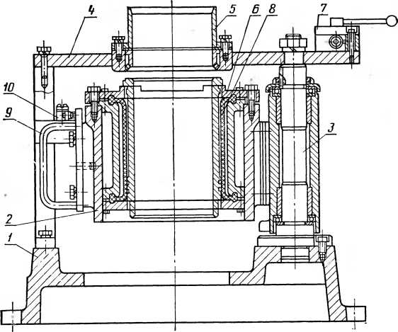 Рис. 73. Приспособление для крепления гильз при хонинговании: 1 — основание; 2 — корпус; 3 — ось; 4 — траверса; 5 — стакан направляющий; 6 — корпус; 7 — кран управления; 8 — диафрагма; 9 — кронштейн; 10 — защелка.