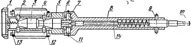 Рис. 74. Хонинговальная головка: 1 — ловитель; 2—штырь; 3 — конус; 4— колодка; 5 — корпус; б—сухарь; 7 — ось; 8 — стержень; 9 — штифт; 10— винт; 11, 12 и 13 — пружины; 14 — толкатель.