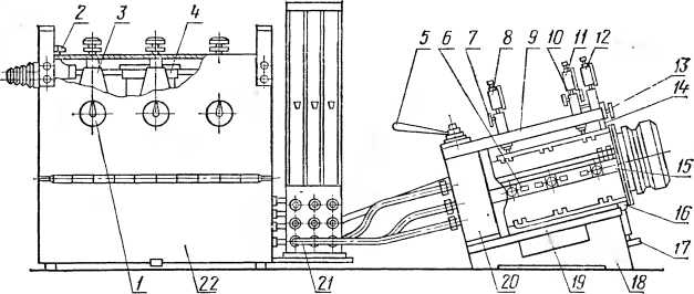 Рис. 77. Приспособление для контроля гильз: 1 — манометр; 2 — кран; 3— блок фильтра со стабилизатором; 4—фильтр-влагомаслоотде-литель; 5 — рукоятка; 6 — измерительное устройство; 7 — винт; 8, 11 и 12 — индикаторы; 9 — поворотная плита; 10 — переходник; 13 — винт; 14 — рычаг; 15 — калибр-пробка; 16 — упор; 17 — винт; 18 — подставка; 19 — плита; 20 — стойка; 21 — длинномер пневматический;: 22 — блок измерения.