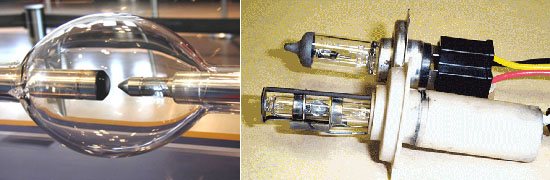 В отличие от «обычной» галогеновой лампочки с нитью накаливания, работу которой изучают ещё в школе, ксеноновые фары представляют из себя специальную колбу, в которую закачан газ «ксенон». К колбе подведены два электрода, пропускающие через газ высокое напряжение, из-за чего ксенон начинает очень ярко светиться.