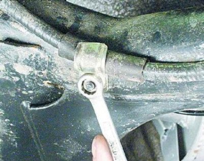 - Отсоедините крепежную гайку, после чего демонтируйте держатель тросика РТ на балке задней подвески автомобиля.