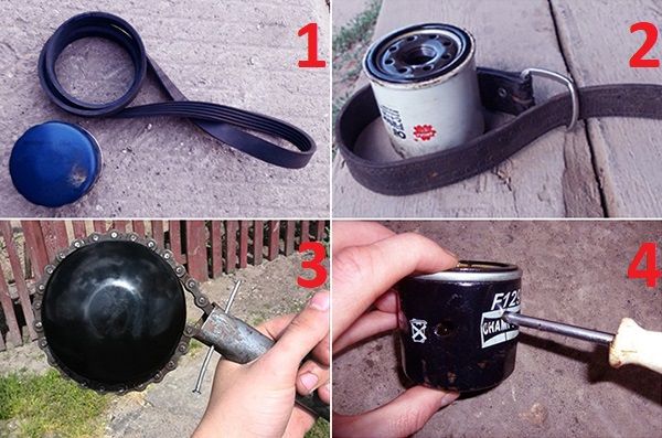 Для откручивания фильтрующего элемента желательно иметь специальный съемник. Ели его не оказалось в наличии, можно попробовать открутить фильтр подручными средствами. Для этих целей можно использовать, например старый ремень генератора, обычный ремень, велосипедную цепь или простую отвертку.