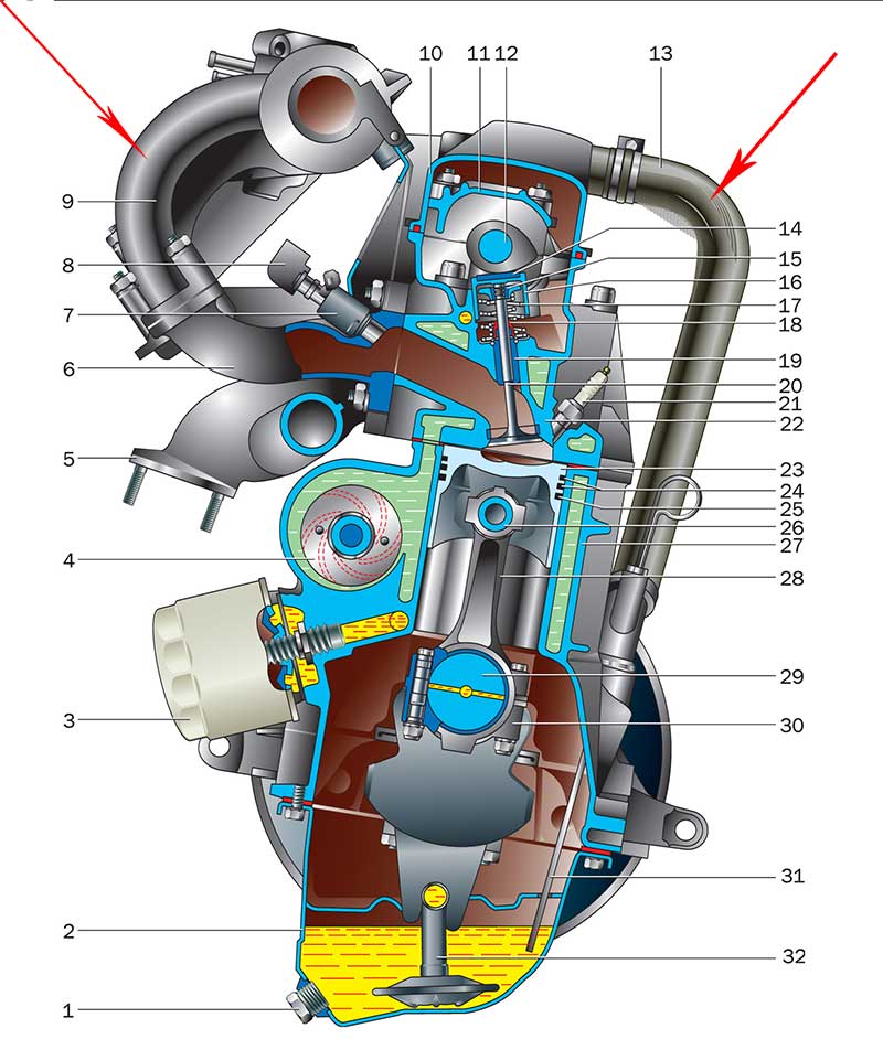 Дополнительно в систему включены элементы, обеспечивающие отделение масла и возврат его обратно в картер, чтобы оно не попало в цилиндры вместе с газами.