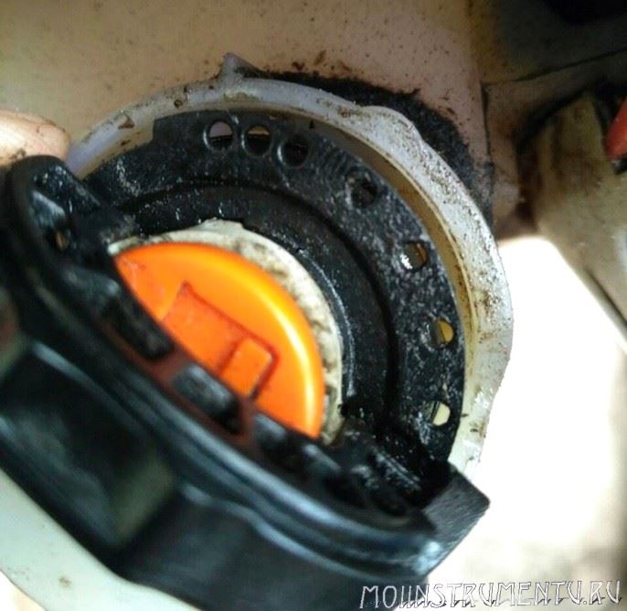 Реже обратный клапан находится в стенке бензобака. Такое расположение можно встретить на устаревших моделях бензокос и бензопил, как показано на фото ниже.