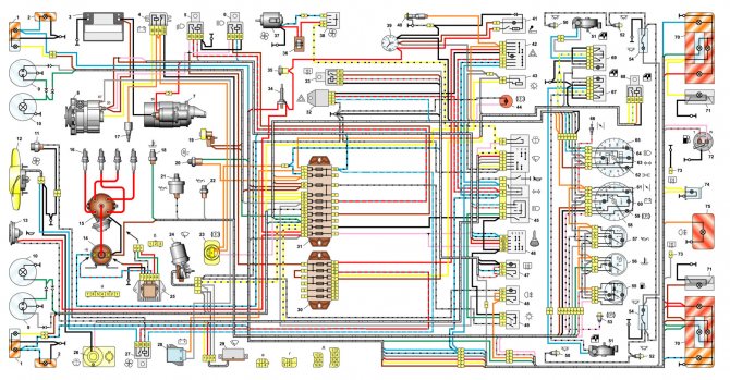 1 — боковые указатели поворота; 2 — подфарники ваз-2106; 3 — наружные фары; 4 — внутренние фары; 5 — звуковые сигналы; б — электродвигатель вентилятора системы охлаждения двигателя ваз 2106; 7 — датчик включения электродвигателя вентилятора ваз 2106; 8 — реле включения звуковых сигналов; 9 — реле включения электродвигателя вентилятора ваз 2106; 10 — регулятор напряжения; 11 — катушка зажигания ваз 2106; 12 — электродвигатель омывателя ветрового стекла; 13 — датчик недостаточного уровня тормозной жидкости; 14 — распределитель зажигания; 15 — электродвигатель стеклоочистителя; 16 — свечи зажигания ваз 2106; 17 — датчик контрольной лампы давления масла; 18 — датчик указателя давления масла; 19 — датчик указателя температуры охлаждающей жидкости; 20 — подкапотная лампа; 21 — электромагнитный клапан карбюратора ваз 2106; 22 — генератор; 23 — стартер; 24 — аккумуляторная батарея; 25 — реле контрольной лампы заряда аккумуляторной батареи; 26 — реле включения ближнего света фар; 27 — реле включения дальнего света фар; 28 — реле стеклоочистителя; 29 — дополнительный блок предохранителей; 30 — основной блок предохранителей; 31 — выключатель света заднего ходы; 32 — выключатель контрольной лампы стояночного тормоза; 33 — штепсельная розетка переносной лампы; 34 — реле-прерыватель указателей поворота и аварийной сигнализации; 35 — электродвигатель отопителя; 36 — выключатель стоп-сигнала; 37 — реле обогрева заднего стекла*; 38 — резистор электродвигателя отопителя; 39 — лампа освещения вещевого ящика; 40 — выключатель наружного освещения; 41 — выключатель обогрева заднего стекла*; 42 — выключатель зажигания ваз 2106; 43 — переключатель ближнего-дальнего света; 44 — переключатель указателей поворота; 45 — выключатель звукового сигнала; 46 — переключатель стеклоочистителя; 47 — выключатель смывателя ветрового стекла; 48 — выключатель (регулятор) освещения приборов; 49 — выключатель аварийной сигнализации; 50 — прикуриватель; 51 — переключатель отопителя; 52 — контрольная лампа уровня тормозной жидкости; 53 — выключатели фонарей сигнализации открытых передних дверей; 54 — фонари сигнализации открытых передних дверей; 55 — выключатели плафонов, расположенные в стойках передних дверей; 56 — указатель уровня топлива с контрольной лампой резерва топлива; 57 — указатель температуры охлаждающей жидкости; 58 — указатель давления масла с контрольной лампой; 59 — тахометр; 60 — контрольная лампа стояночного тормоза; 61 — контрольная лампа заряда аккумуляторной батареи; 62 — контрольная лампа воздушной заслонки карбюратора; 63 — спидометр; 64 — контрольная лампа наружного освещения; 65 — контрольная лампа указателей поворота; 66 — контрольная лампа дальнего света фар; 67 — реле-прерыватель контрольной лампы стояночного тормоза; 68 — выключатель контрольной лампы воздушной заслонки карбюратора; 69 — часы; 70 — выключатели плафонов, расположенные в стойках задних дверей; 71 — плафоны; 72 — элемент обогрева заднего стекла; 73 — лампа освещения багажника; 74 — датчик указателя уровня и резерва топлива; 75 — задние фонари; 76 — фонари освещения номерного знака.