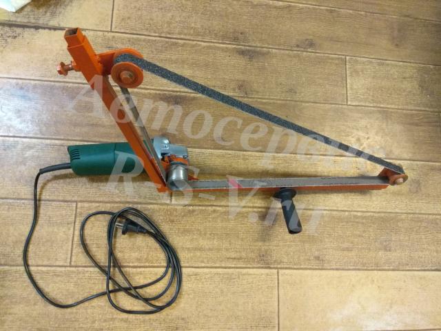 В нашем же случае (автосервиса) необходимость иметь такое устройство было продиктована четко определенной задачей — постоянно таскать в другие мастерские (на мех. завод) коленчатые валы от находящихся в ремонте двигателей и неудобно (напоминаю о том, что весят эти железки немало, и тем тяжелее, чем больше по объему двигатель. А если в ремонте находится двигатель даже легкого грузовика, то удовольствие тут ниже среднего); и еще одна причина — потеря времени на обработку, да и денег отдавать за то, что можно сделать самостоятельно, тоже неохота. Ну так и вот.. был изготовлен универсальный по сути и оптимальный при работе инструмент — ручная ленточная шлифовальная машина сабельного типа. Практически из подручных материалов сварена металлоконструкция, напоминающая смычек, на которой были закреплены два ролика с «ложбинкой» на рабочей поверхности (с бортиками), один из которых сидел на жесткой оси, приваренной к «смычку», а второй — подвижный, с помощью которого можно натягивать установленную шлифовальную ленту. Приводит в движение ленту третий ролик, смонтированный на валу «болгарки» (углошлифовальной машинки), так же имеющего боковые ограничительные бортики. Электродвигатель машинки имеет ручку плавной регулировку скорости вращения, позволяющую изменять скорость движения ленты.