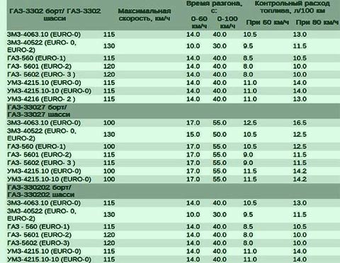 Таблица сравнения расхода топлива в различных модификациях автомобиля Газель
