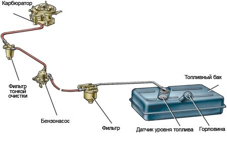 Система питания топливом карбюраторного двигателя включает в себя топливный бак 1, фильтры грубой 2 и тонкой 4 очистки топлива, топливоподкачивающий насос 3, карбюратор 5, впускной трубопровод 7 и топливопроводы. При работе двигателя топливо из бака 1 с помощью насоса 3 подается через фильтры 2 и 4 к карбюратору. Там оно в определенной пропорции смешивается с воздухом, поступающим из атмосферы через воздухоочиститель 6. Образовавшаяся в карбюраторе горючая смесь по впускному коллектору 7 попадает в цилиндры двигателя.