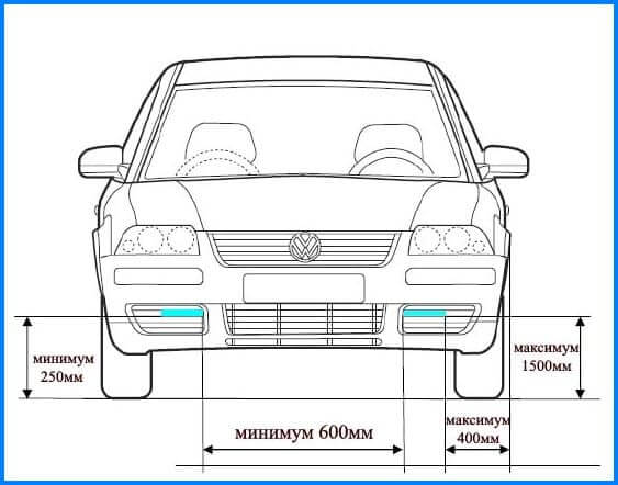 - Между двумя фонарями ДХО минимальное расстояние составляет 600 мм. Для автомобилей шириной до 1300 мм этот параметр уменьшается до расстояния 400 мм.