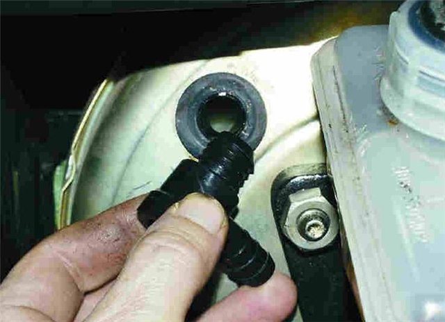 - Повреждение или ослабление крепления шланга соединяющего ВУ с впускным коллектором. В первом случае резиновую трубку нужно заменить, а во втором варианте придется подтянуть хомуты крепления или заменить их при наличии повреждений. Данная причина является самой распространенной и требует регулярного контроля и осмотра надежности крепления. Состояние шланга необходимо систематически проверять. Он изготавливается из специального полимера, который при охлаждении становиться жестким, после включения двигателя и прогрева материал становится гибким. Из-за этого снижается его пропускная способность. Вследствие данной проблемы возникают неполадки в работе тормозной педали. Чтобы не сталкиваться с этой неисправностью, нужно приобретать качественные детали, с конкретными термическими параметрами.