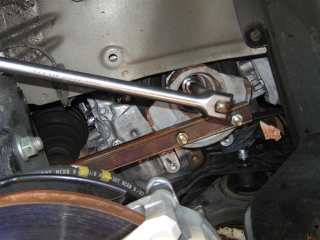 - под колёсной аркой на болт шкива надевается головка с удлинителем и рычагом;