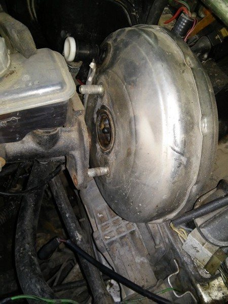 вытаскиваем клапан со шланком с вакуумного усилителя (далее — ВУТ), откручиваем гайки крепления главного тормозного цилиндра и осторожно отодвигам его от ВУТ, получается как то так…
