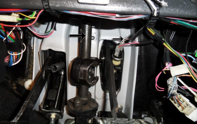 Болты отмечены стрелочками. Можно снять вместе с педалью, тогда отсоедините и фишку на педали тормоза
