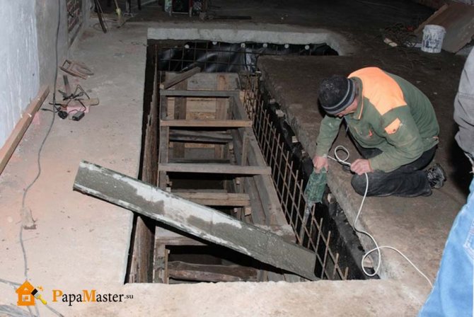 После того, как пол окончательно высох, настал черёд стен. Для них также сооружается опалубка, укладывается гидроизоляционная мембрана и устанавливается армирующий каркас, который добавит стенам прочности. На данном этапе можно подогнать толщину стен под готовые размеры смотровой ямы в гараже.